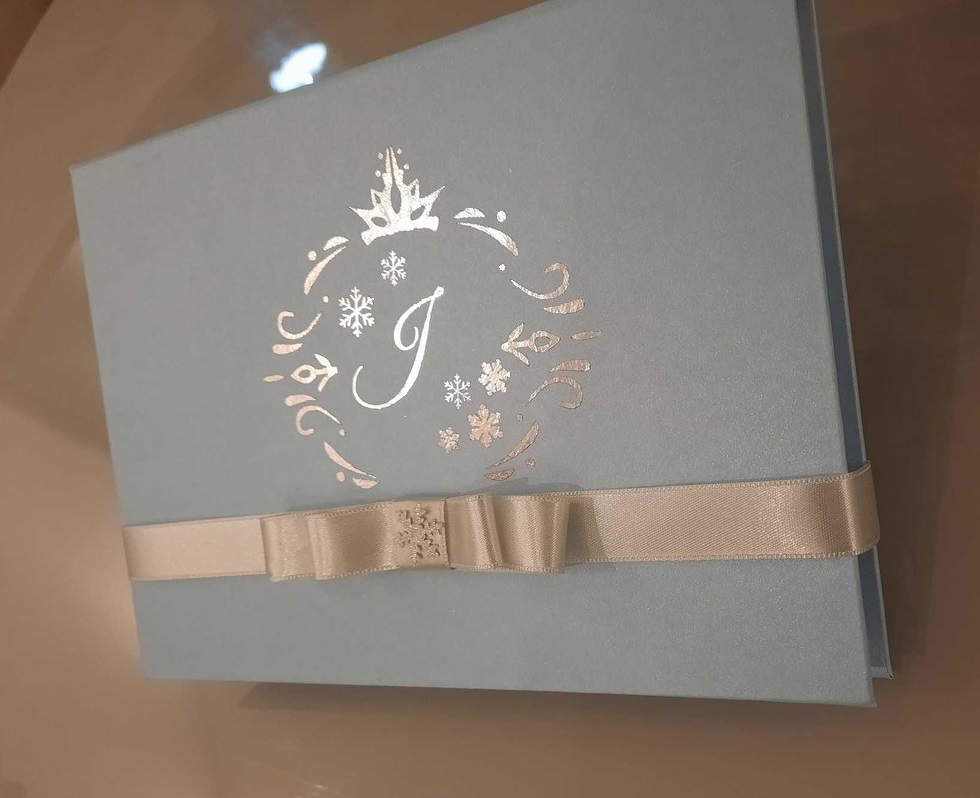 Convite caixa forrada em papel perolado, com letras em hot stamping e detalhes em 3D. Acompanha tag com o nome do convidado de brinde.