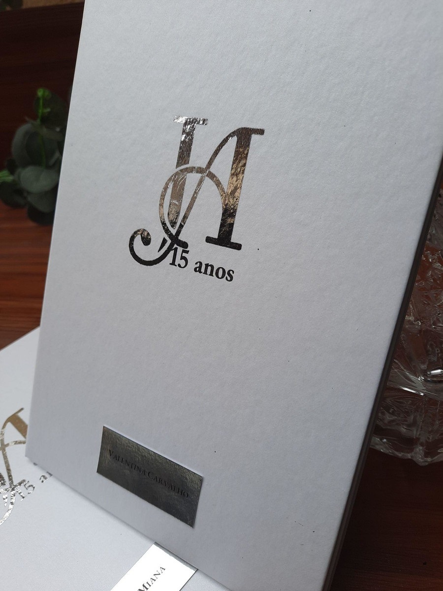 Todo ele no papel perolado com letra em hot stamping. Interior com transparência e gliter. Já acompanha tag com o nome do convidado de brinde.
