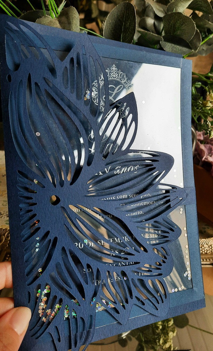 Envelope recorte, com convite com detalhe em transparênciae gliter.