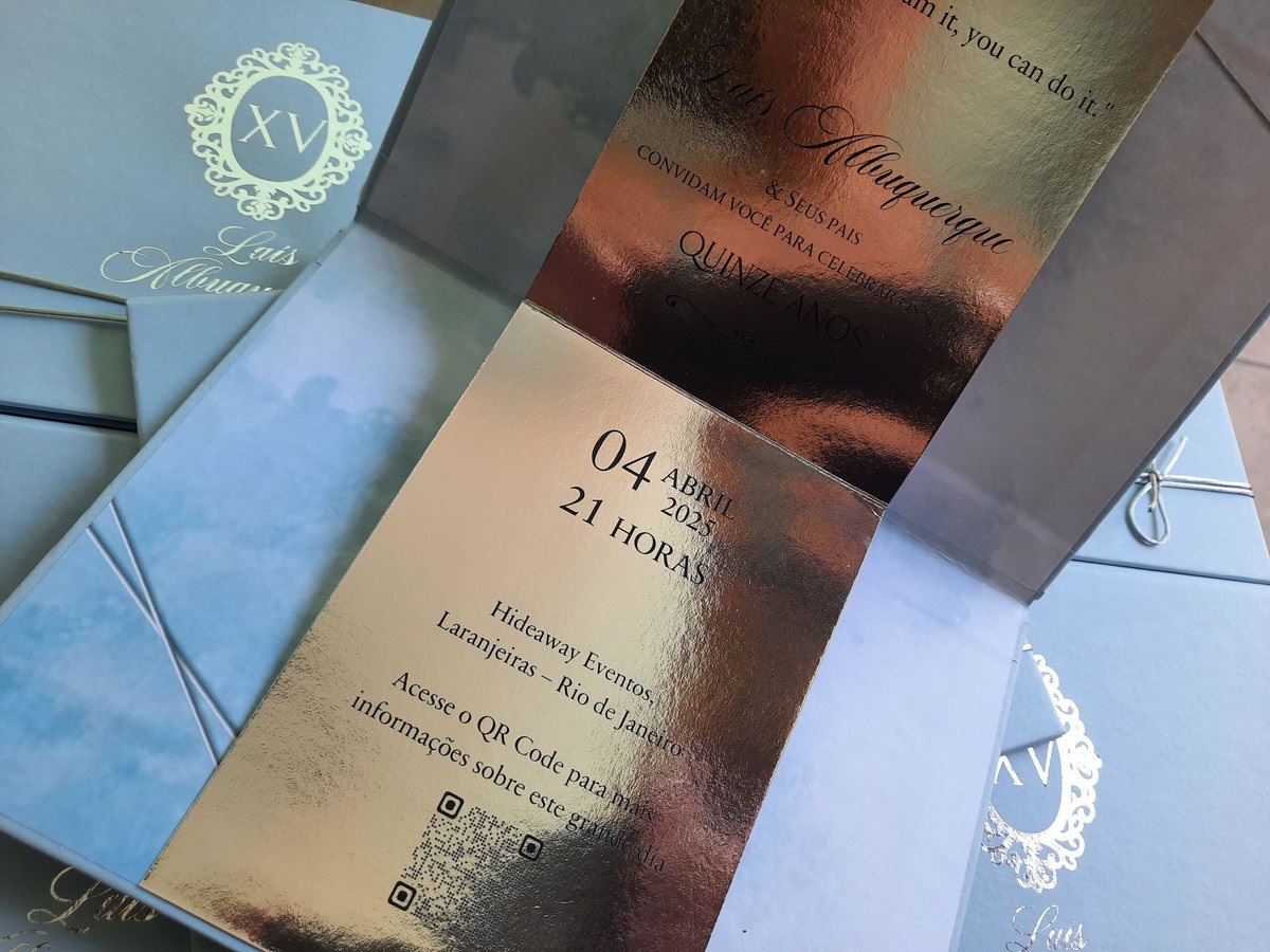 Convite com laminado e o interior tipo espelhado que é um espetáculo. Fechamento cordão de seda.